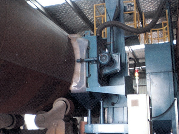 內(nèi)壁拋丸小車在橫梁上進(jìn)行拋丸的同時(shí),也在橫梁上行走,行走是變頻調(diào)速的,被打完的塔筒表面呈現(xiàn)一定寬度寬的環(huán)形螺旋狀的銀白色條帶,將小車的行走速度與塔筒的轉(zhuǎn)速進(jìn)行相配合,使之相鄰的銀白色條帶相互重合,可使塔筒表面無(wú)任何遺漏。鋼管打砂的方式可以改變?yōu)椋涸诖蛏暗倪^程中,打砂小車不同時(shí)移動(dòng),打完一圈后,在移動(dòng)一個(gè)工作位置,再打一圈。直至將鋼管內(nèi)壁打完。