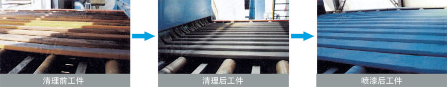 該設(shè)備主要由輸入輥道、預(yù)熱室、拋丸清理室、過渡棍道、噴漆室、烘干室、輸出輯道、除塵系統(tǒng)及電氣控制系統(tǒng)等組成。